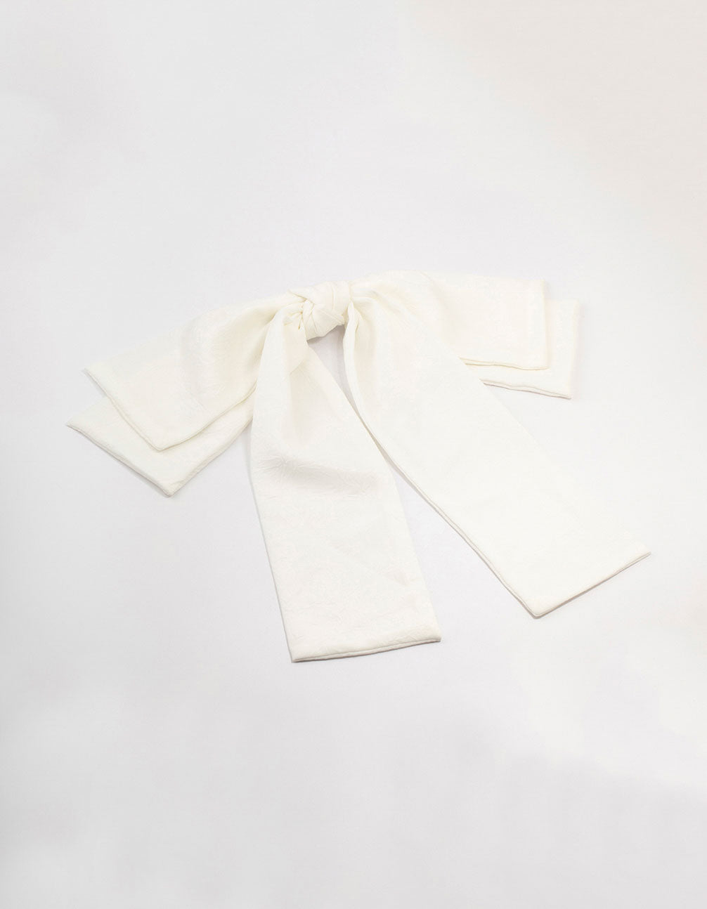 Achieve effortless chic with our elegant white crepe fabric bow. This stylish hair accessory effortlessly enhances different hair styles with its chic design. The timeless white color complements any outfit and adds some playfulness to your looks.