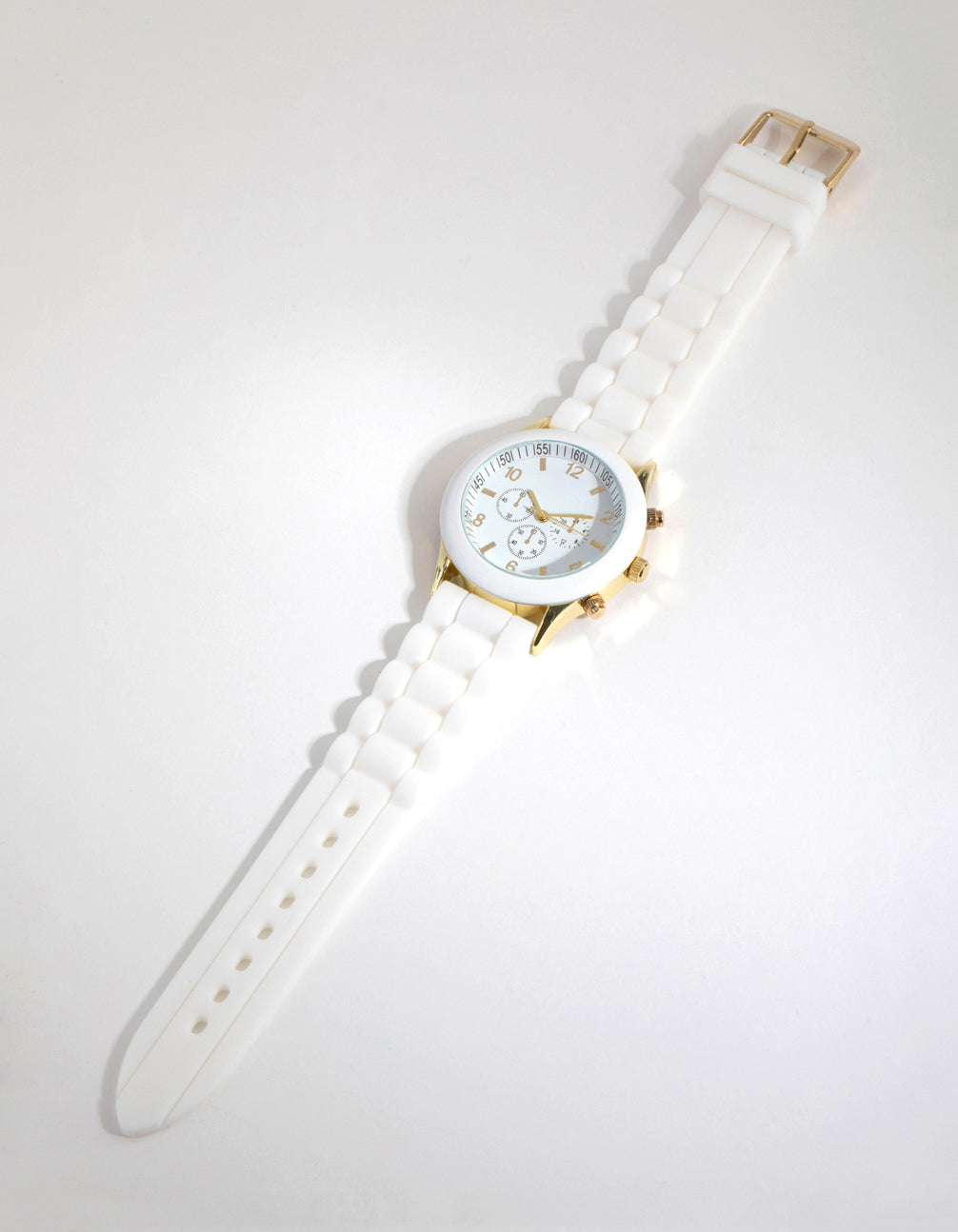 Tell the time and look stylish while doing it! A watch is the ultimate useful fashion accessory. This watch features a white silicon strap with a link design. It has gold-toned markers with a white dial and bezel. Classy and beautiful, wear this everyday!