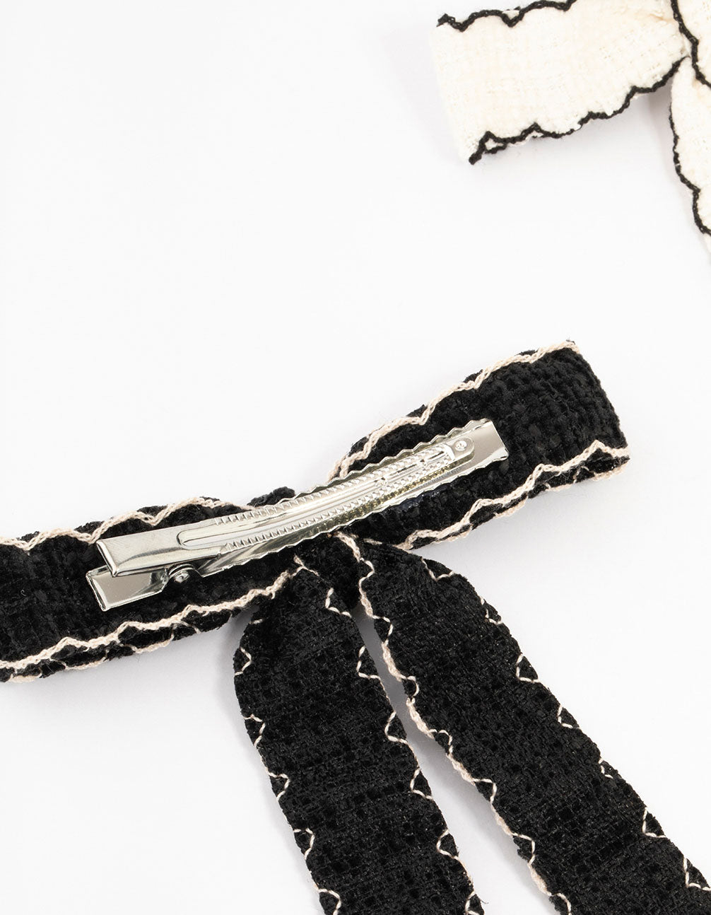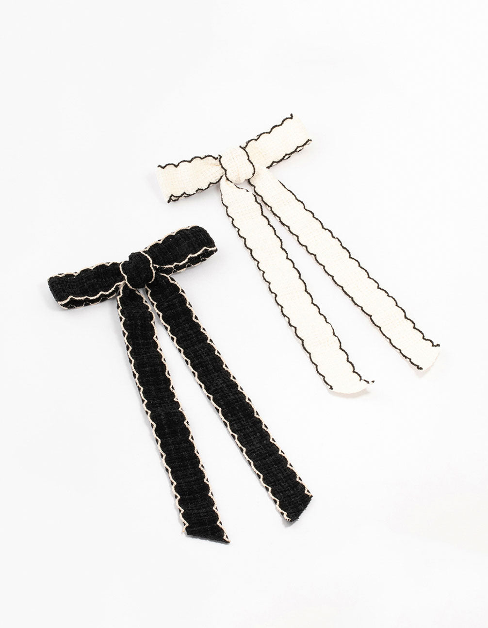 Double the charm with this chic accessory set! Featuring two stunning fabric bows crafted from woven scallop fabric, these black and white beauties add playful texture to your hair. Embrace preppy chic effortlessly with this perfect pair.
