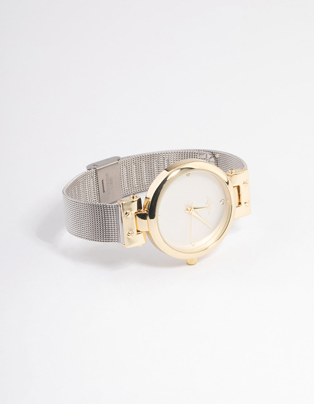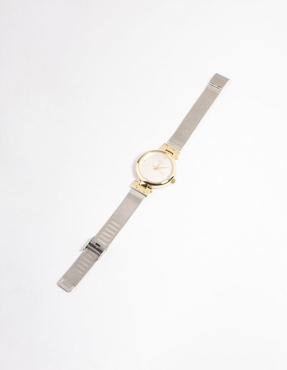 - This watch features a mixed metal setting with a timeless, mesh strap.