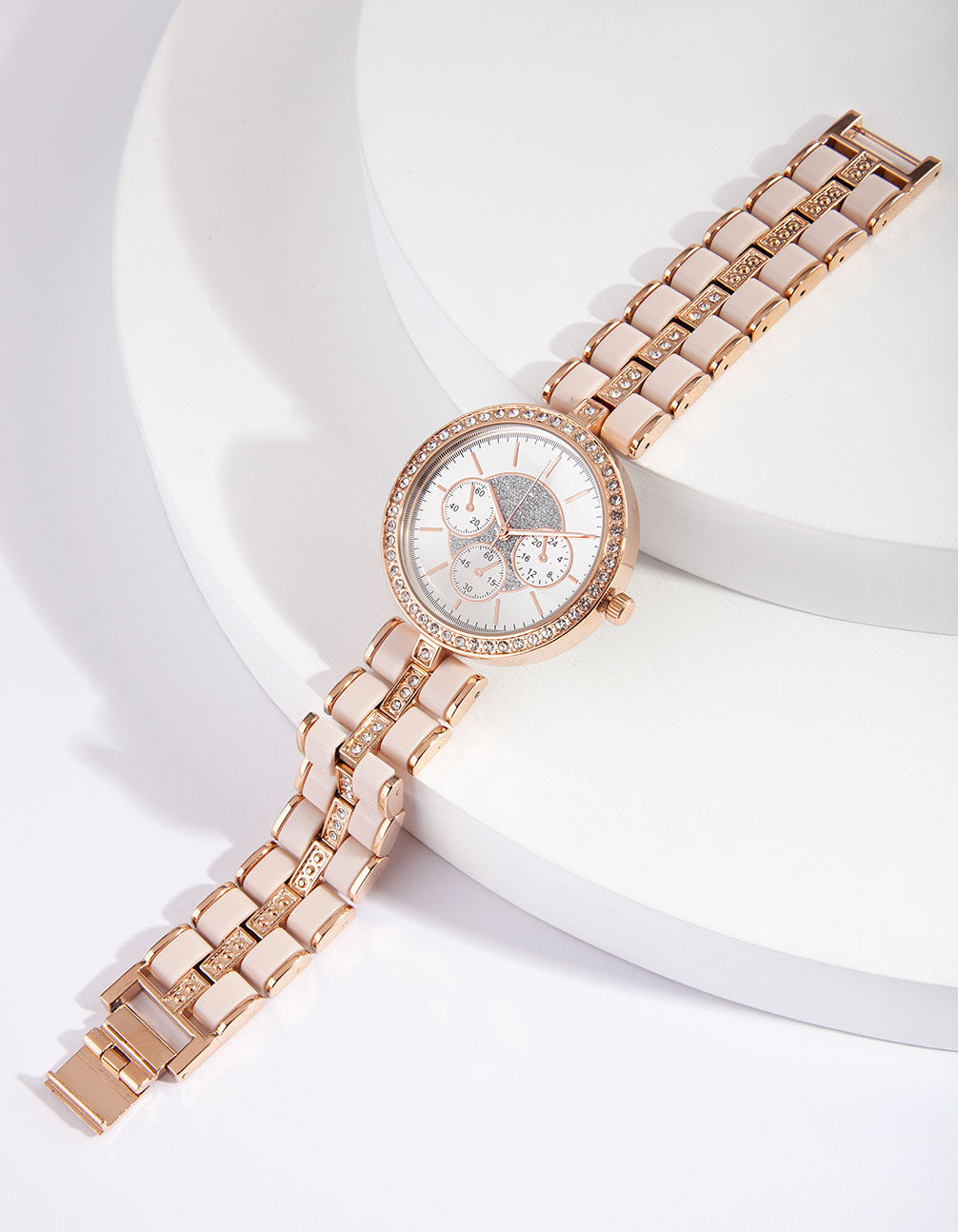 A timepiece is a classic accessory that will stay in style season after season. This watch is both functional and fashionable and features a pink enamel and diamante design on a rose-gold-toned setting.