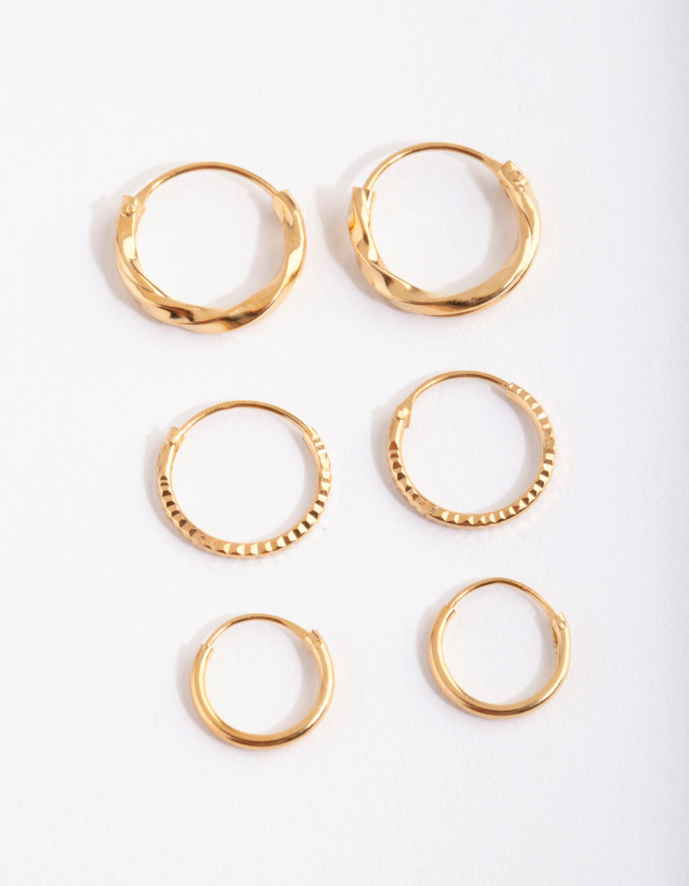 Our sterling silver range is the perfect blend of fashionable yet functional styles! This gold plated sterling silver earring pack boasts graduating textured hoop designs. Perfect for everyday wear!
